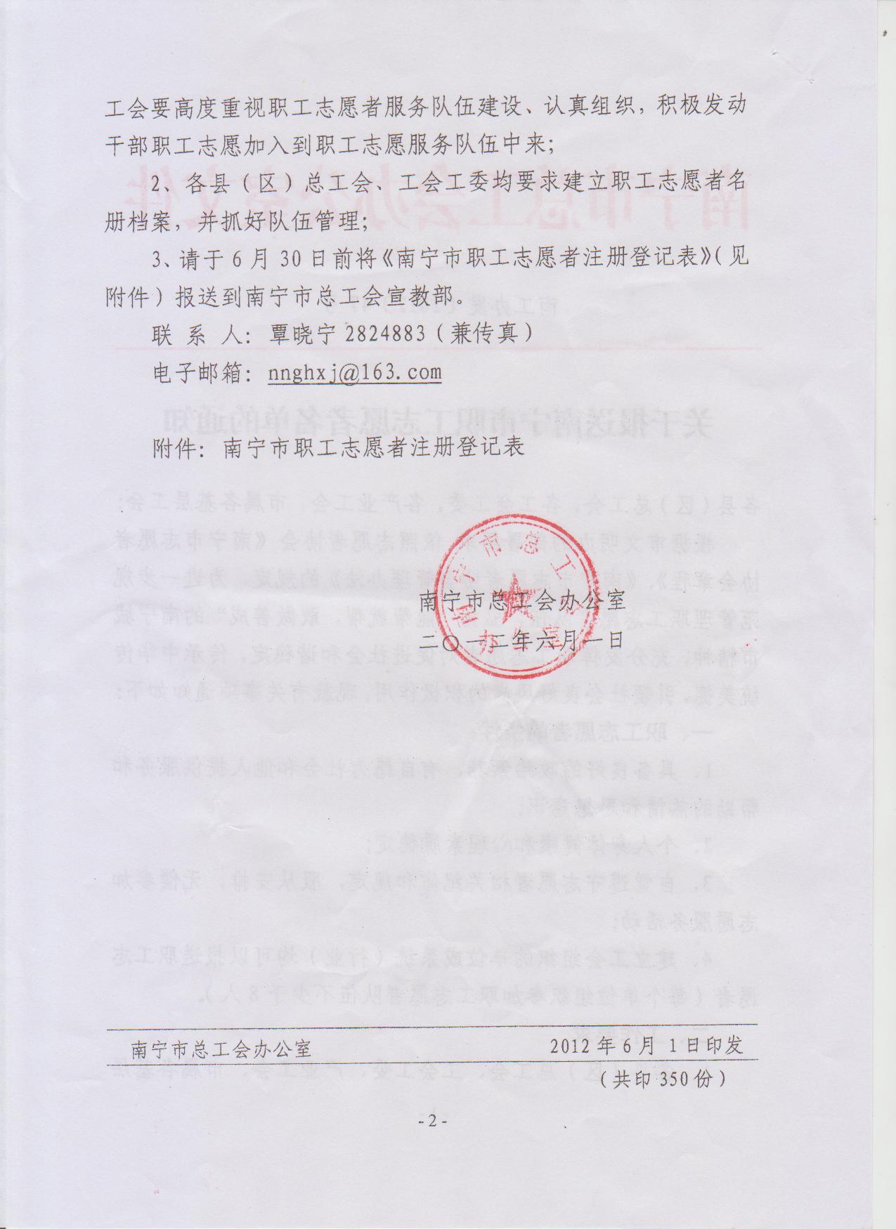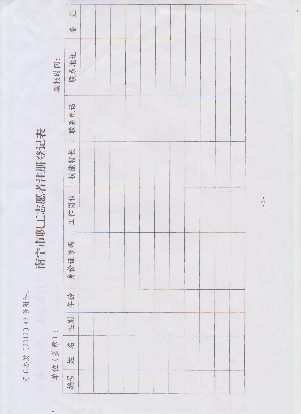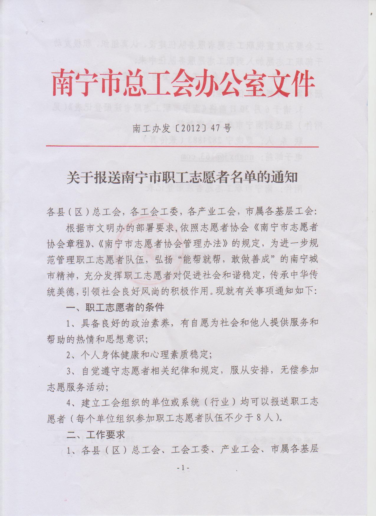 關(guān)于報(bào)送南寧市職工志愿者名單的通知(南工辦發(fā)[2012]47號(hào))